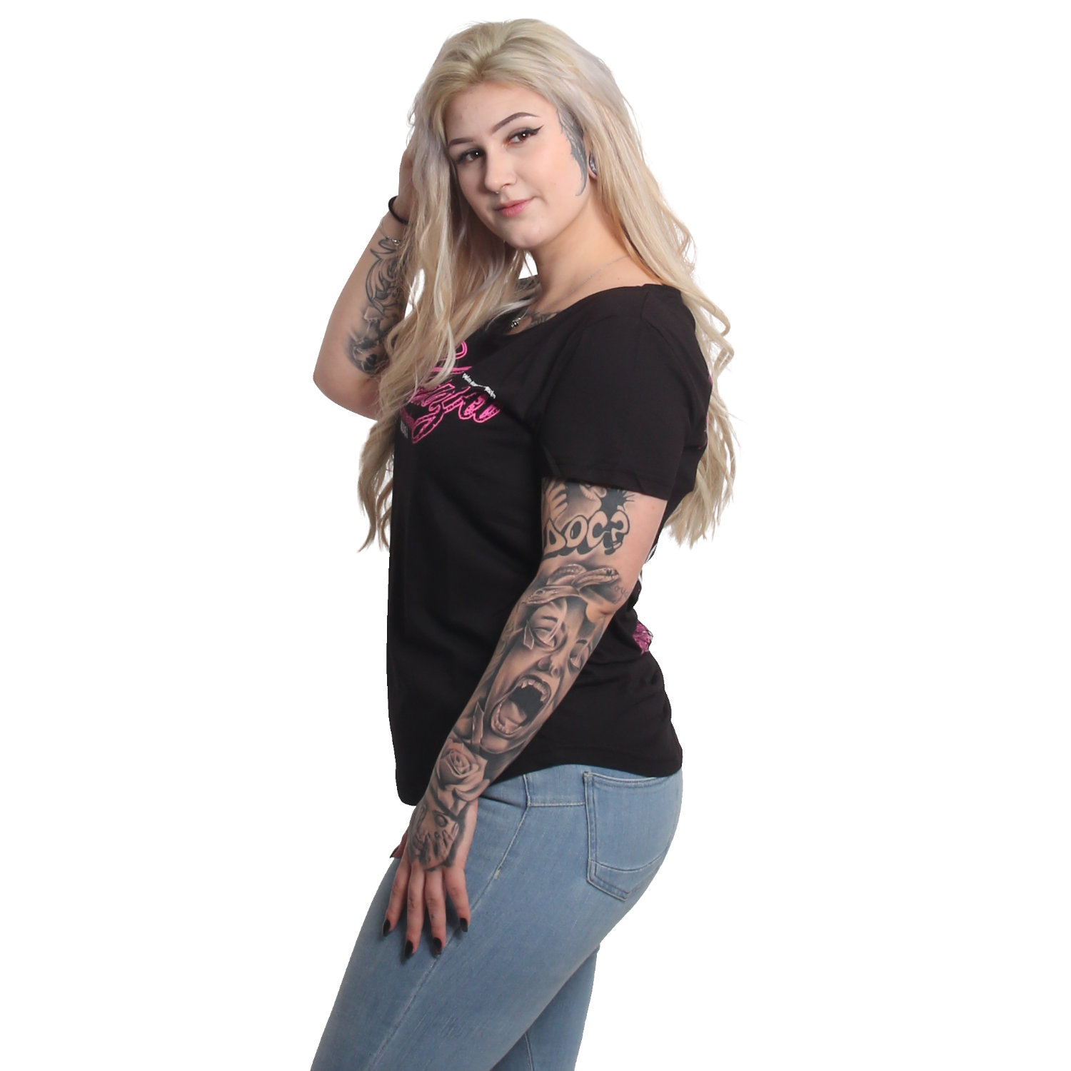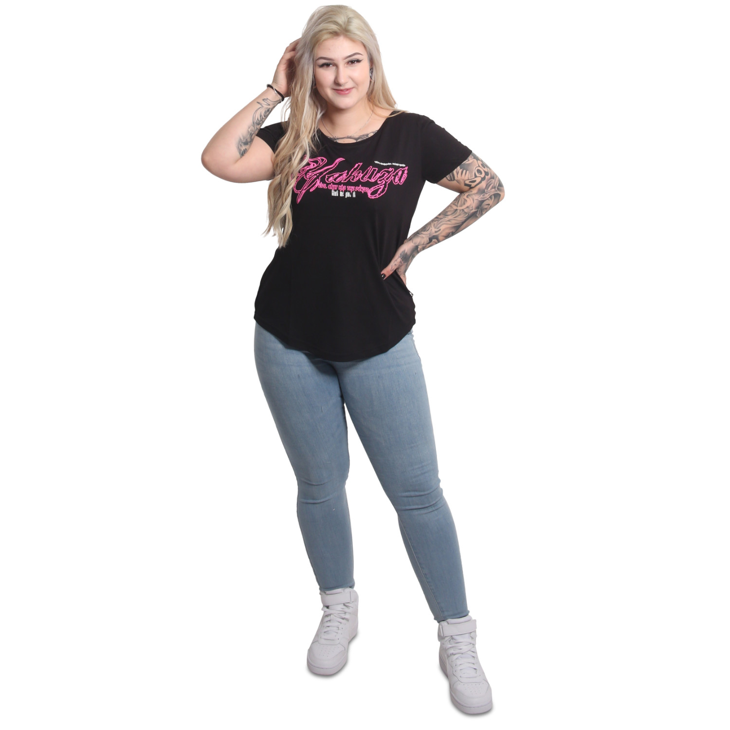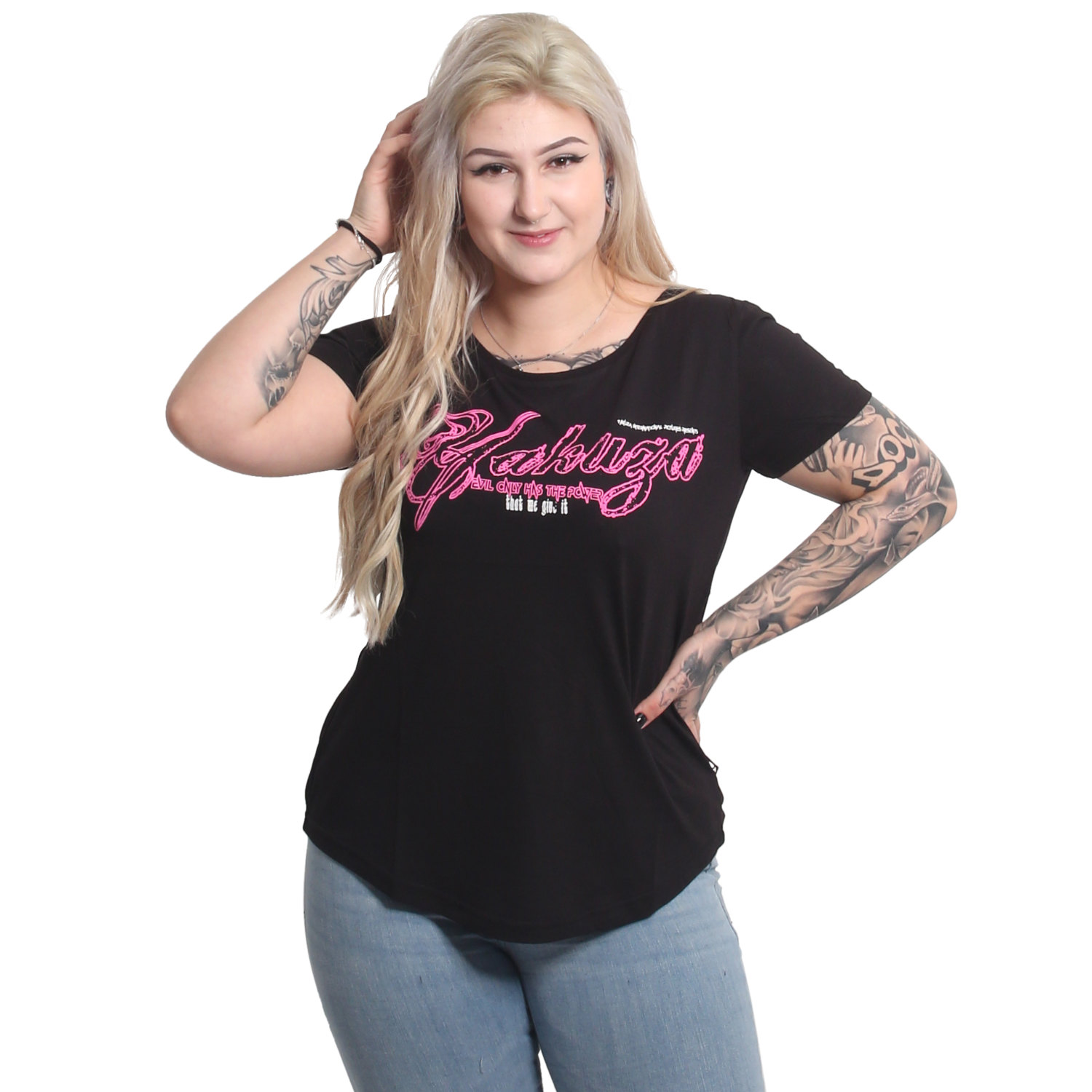YAKUZA EVIL ONLY women's t-shirt. Perfect for relaxed styling: Not too slim, not too loose, just right. This t-shirt features a ribbed crew neck and vintage print designs. It's completed with a logo tab on side seam. Please watch out for our size specifications and the washing instructions below.