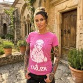 YAKUZA NUN women's t-shirt. Perfect for relaxed styling: Not too slim, not too loose, just right. This t-shirt features a ribbed crew neck as well as vintage print designs. It's completed with a logo tab on side seam. Please watch out for our size specifications and the washing instructions below.