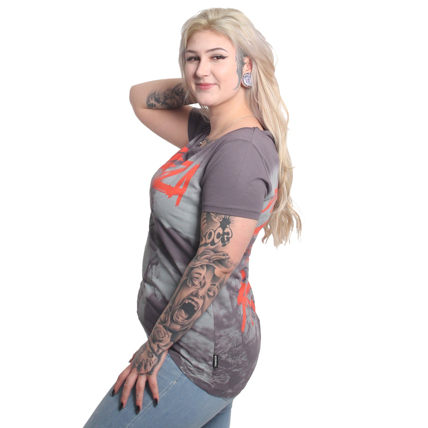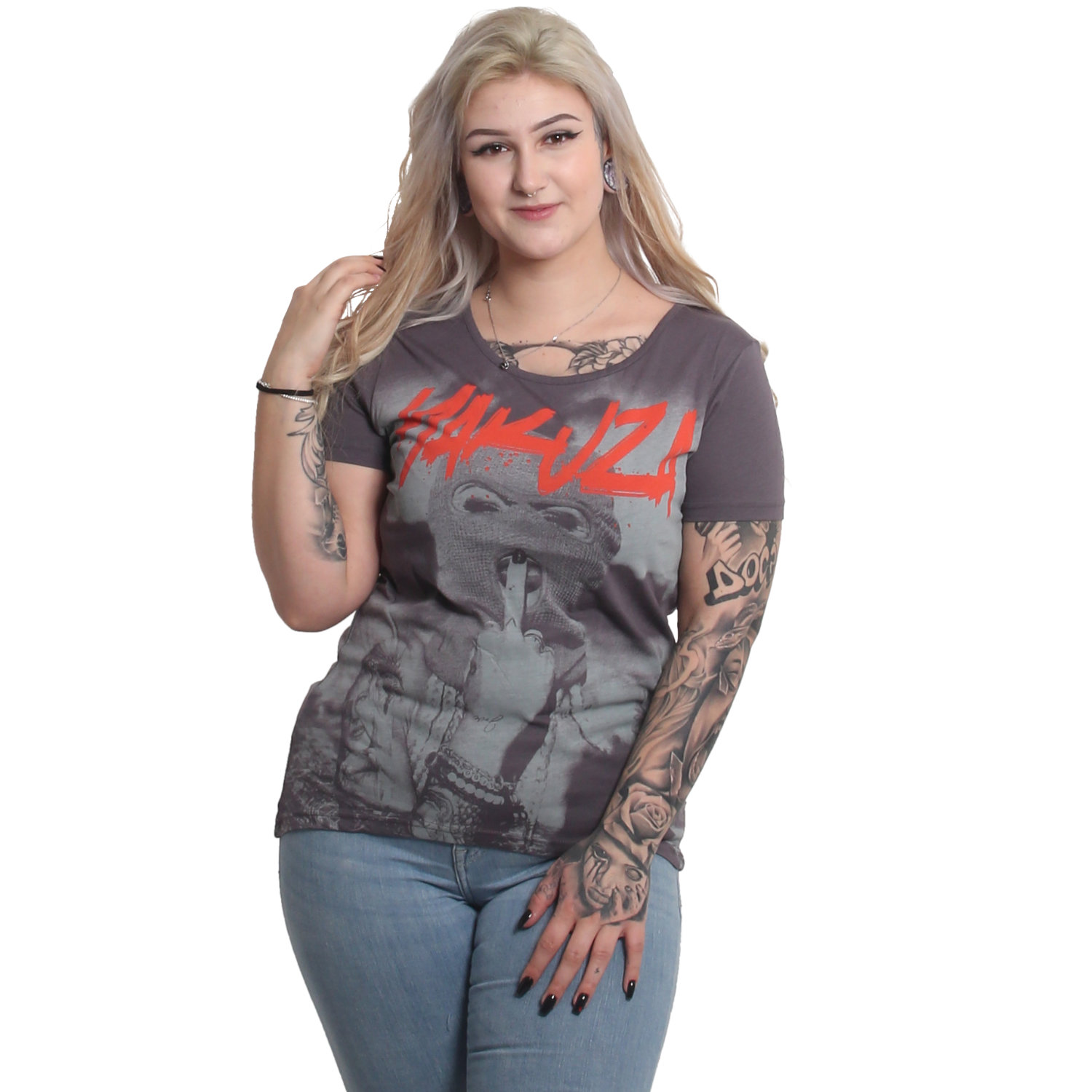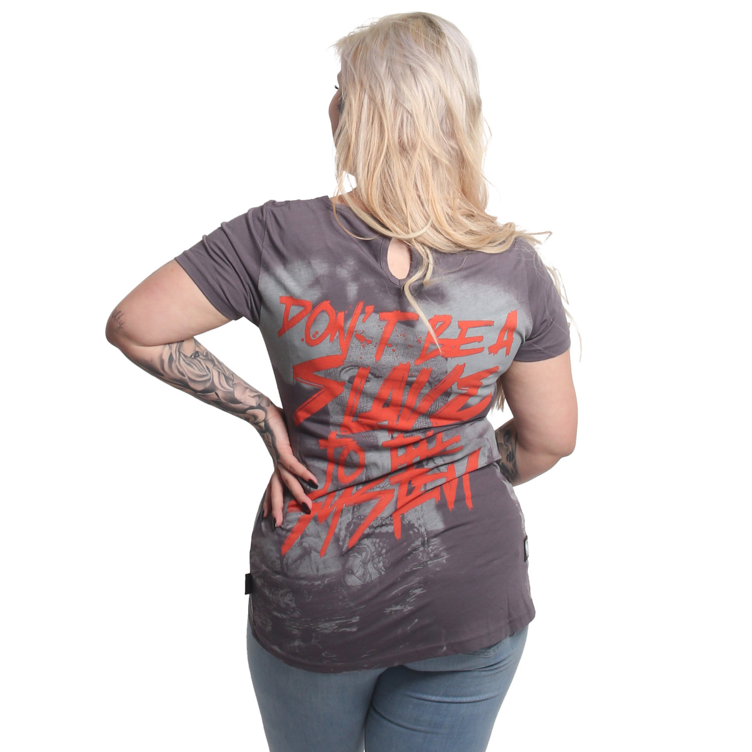 YAKUZA SLAVE women's t-shirt. Perfect for relaxed styling: Not too slim, not too loose, just right. This t-shirt features a wide crew neck, short sleeves and print designs. This shirt shows an elongated backside that looks unique. The t-shirt is completed with a logo tab on side seam. Please watch out for our size specifications and the washing instructions below.