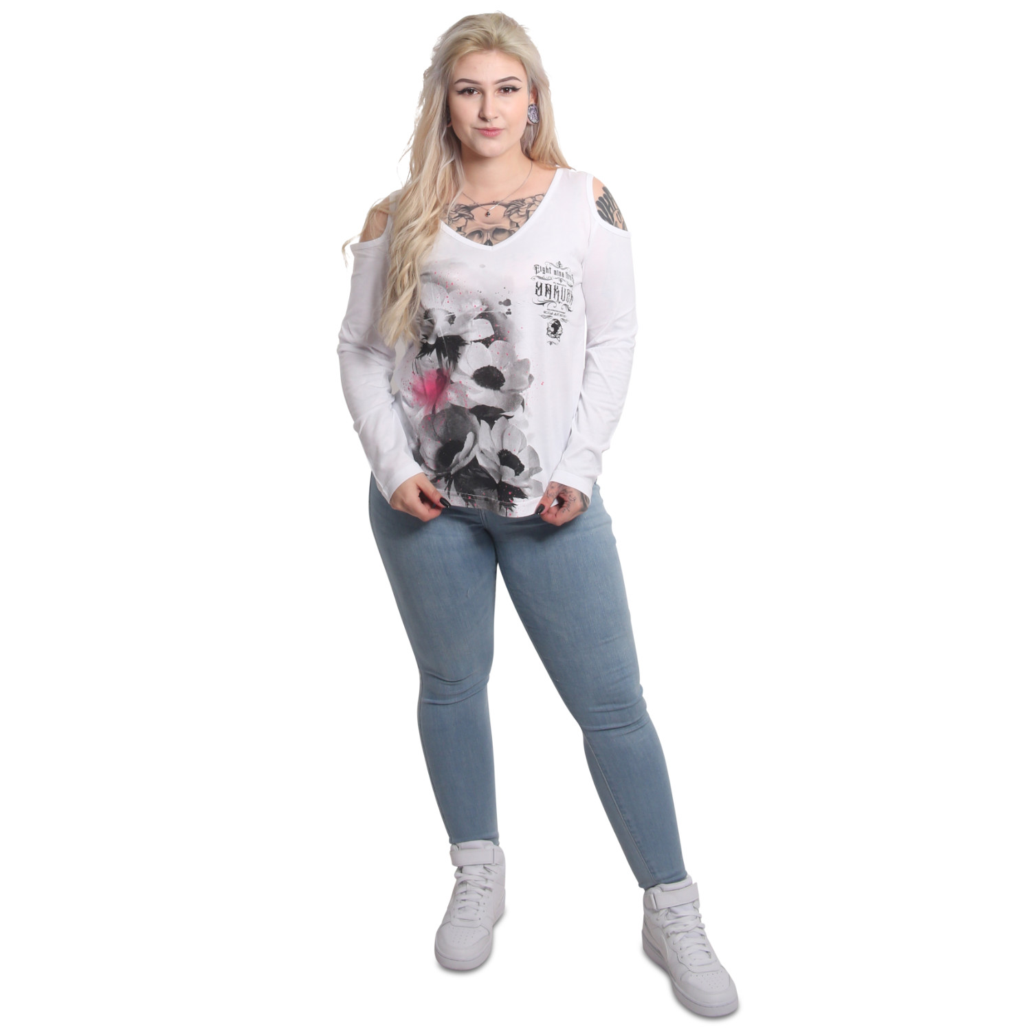 YAKUZA FLOWER STYLE Oberteil für Damen. Dieses lässige, weich fließende Shirt mit V-Ausschnitt, langen Armen und modischen Cut-Outs an den Schultern ist dein neues Alltagsteil. Die lässige Passform ist nicht zu eng, nicht zu weit, sondern genau richtig. Vervollständigt mit großem Yakuza Logoprint auf Brust und Rücken. Ein Yakuza-Logoetikett an der Seitennaht rundet den Look ab. Trage dazu eine Röhrenjeans oder Shorts für einen stylishen Auftritt. Bitte beachte die Größenangaben und unsere Waschanleitung.