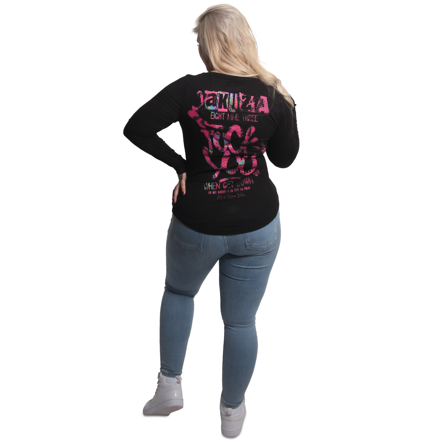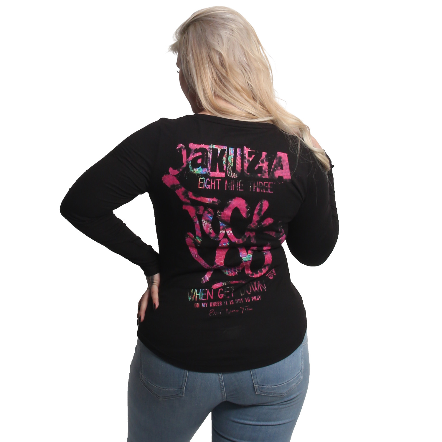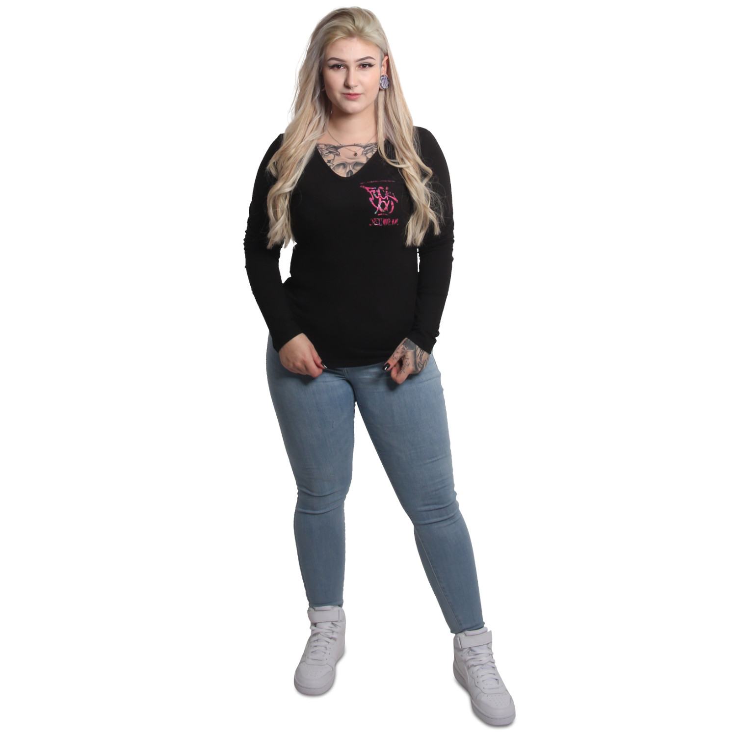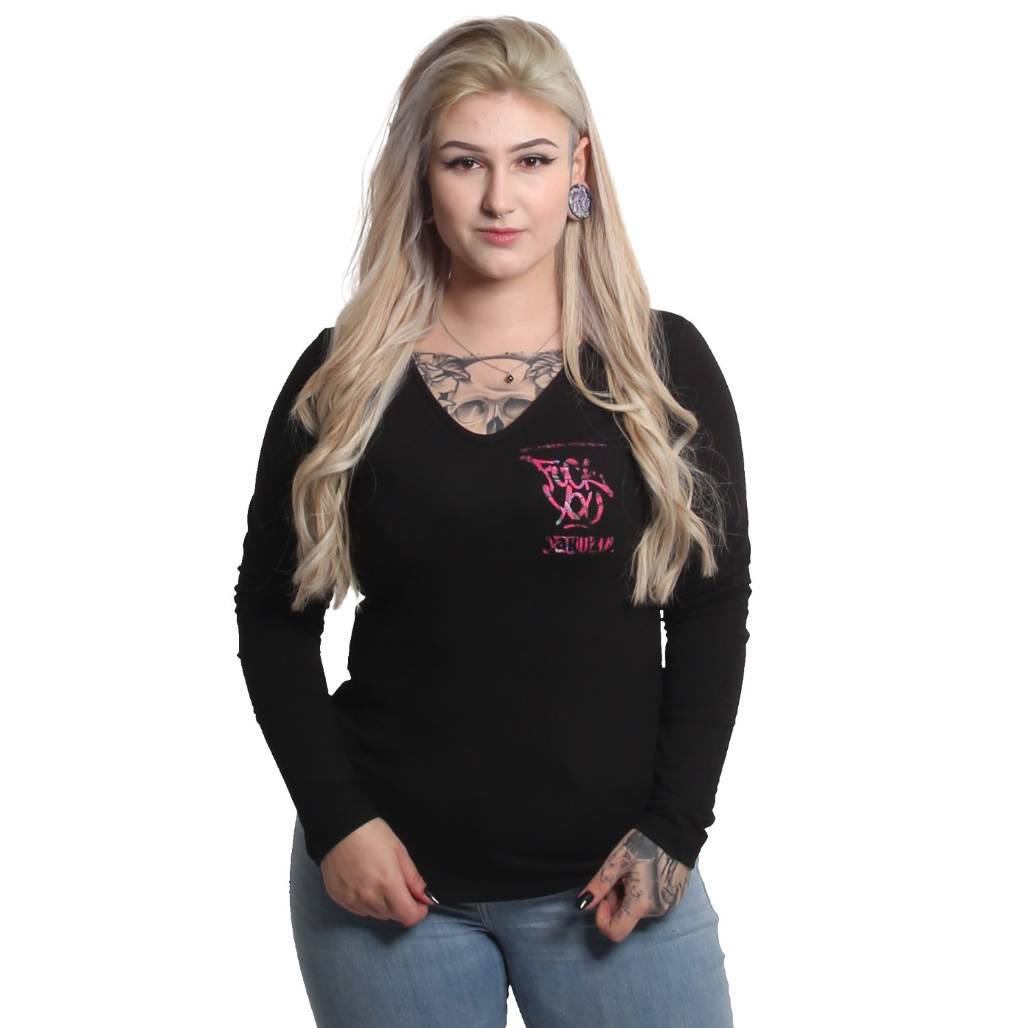 YAKUZA FU Shirt mit V-Ausschnitt für Damen. Dieses figurbetont geschnittene Shirt mit V-Ausschnit und langen Armen ist dein neues Alltagsteil. Vervollständigt mit gerippten Armabschlüssen, Vintage-Prints und einem Logoetikett an der Seitennaht. Trage dazu deine Lieblingsjeans für den perfekten Alltags-Look. Bitte beachte die Größenangaben und unsere Waschanleitung.